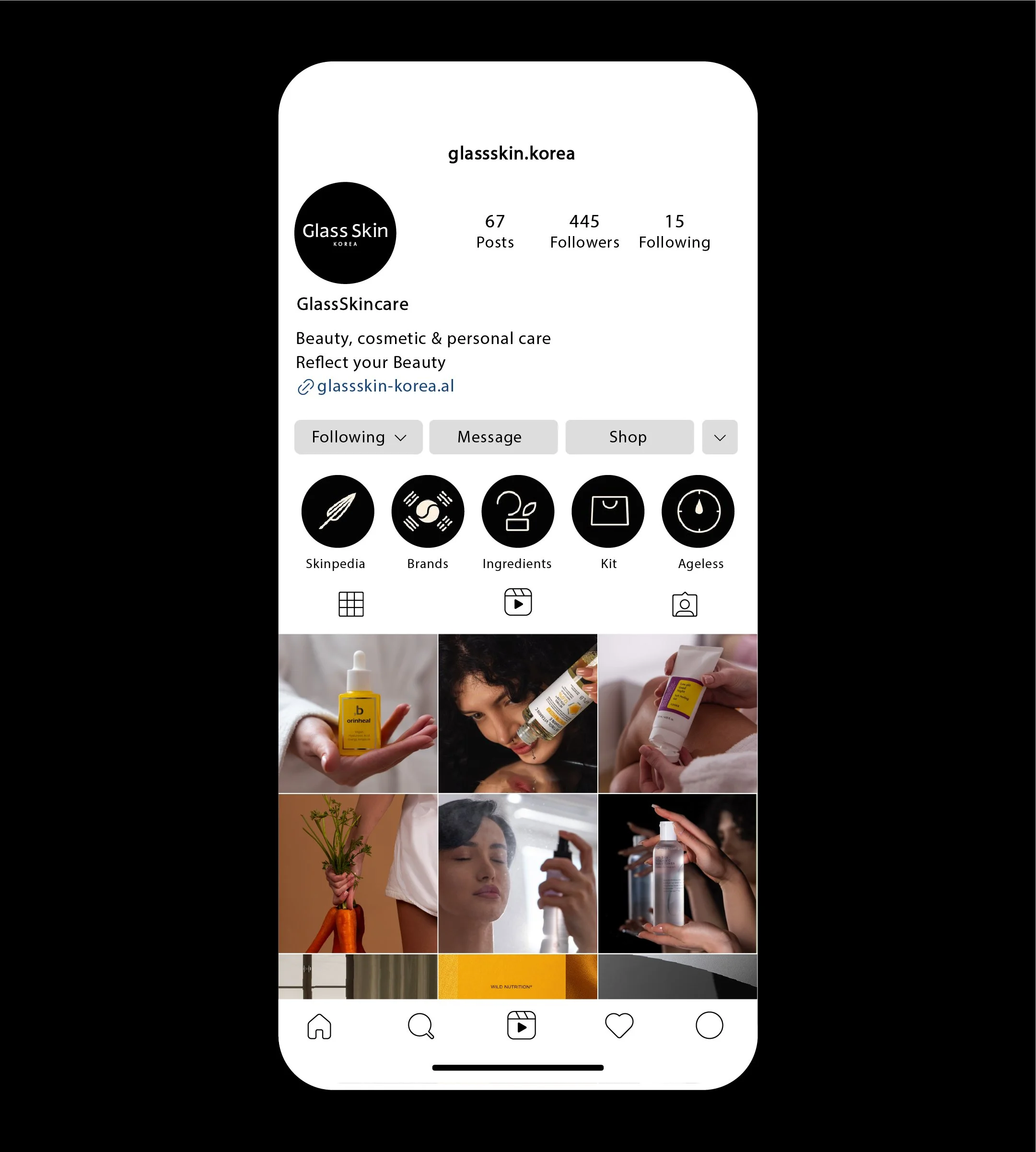 With a layout defined by the contrast between generous white space and minimal typography, GlassSkin conveys a sense of purity and positions itself as a high-quality, natural, and healthy brand, speaking directly to the audience it targets.